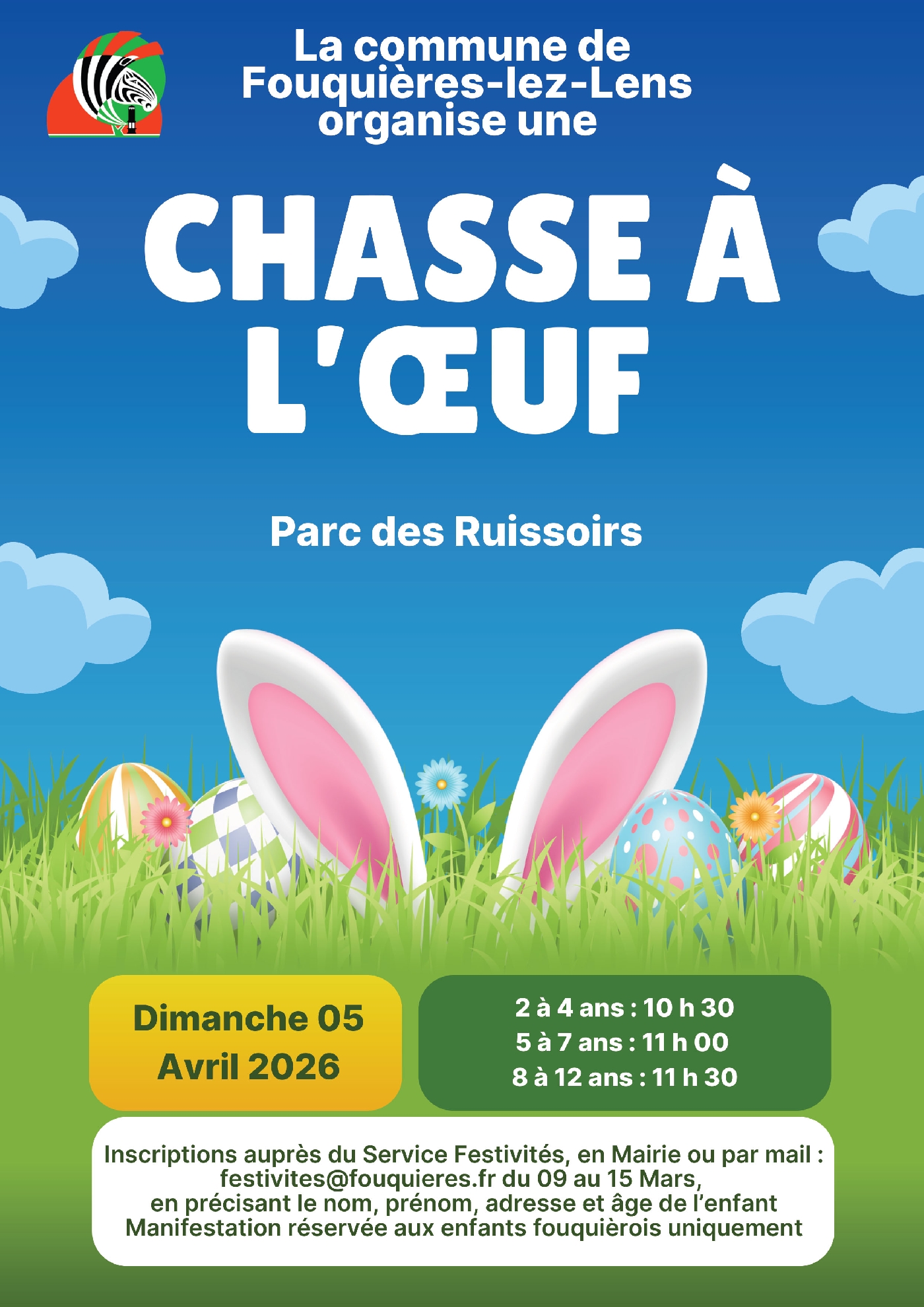 Inscriptions auprès du Service Festivités, en Mairie ou par mail : festivites@fouquieres.fr du 09 au 15 Mars, en précisant le nom, prénom, adresse et âge de l'enfant.
